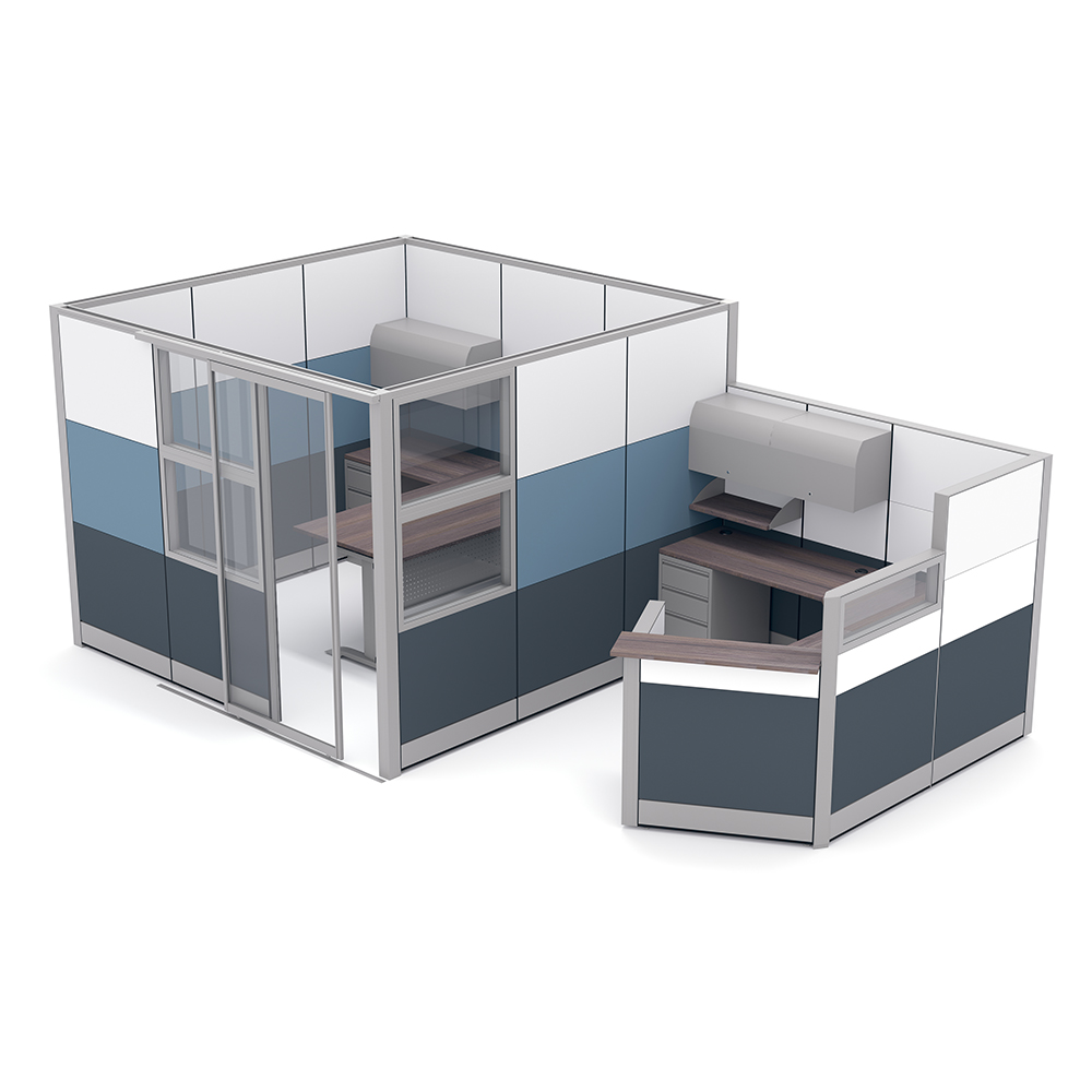 Cubicle Reception Desk | Sapphire Wall System | 16’W x 9’D x 84″H2-Person Cubicle Workstation | Laminate Gallery Panels | Sol Series | 6x6x52″-39″H