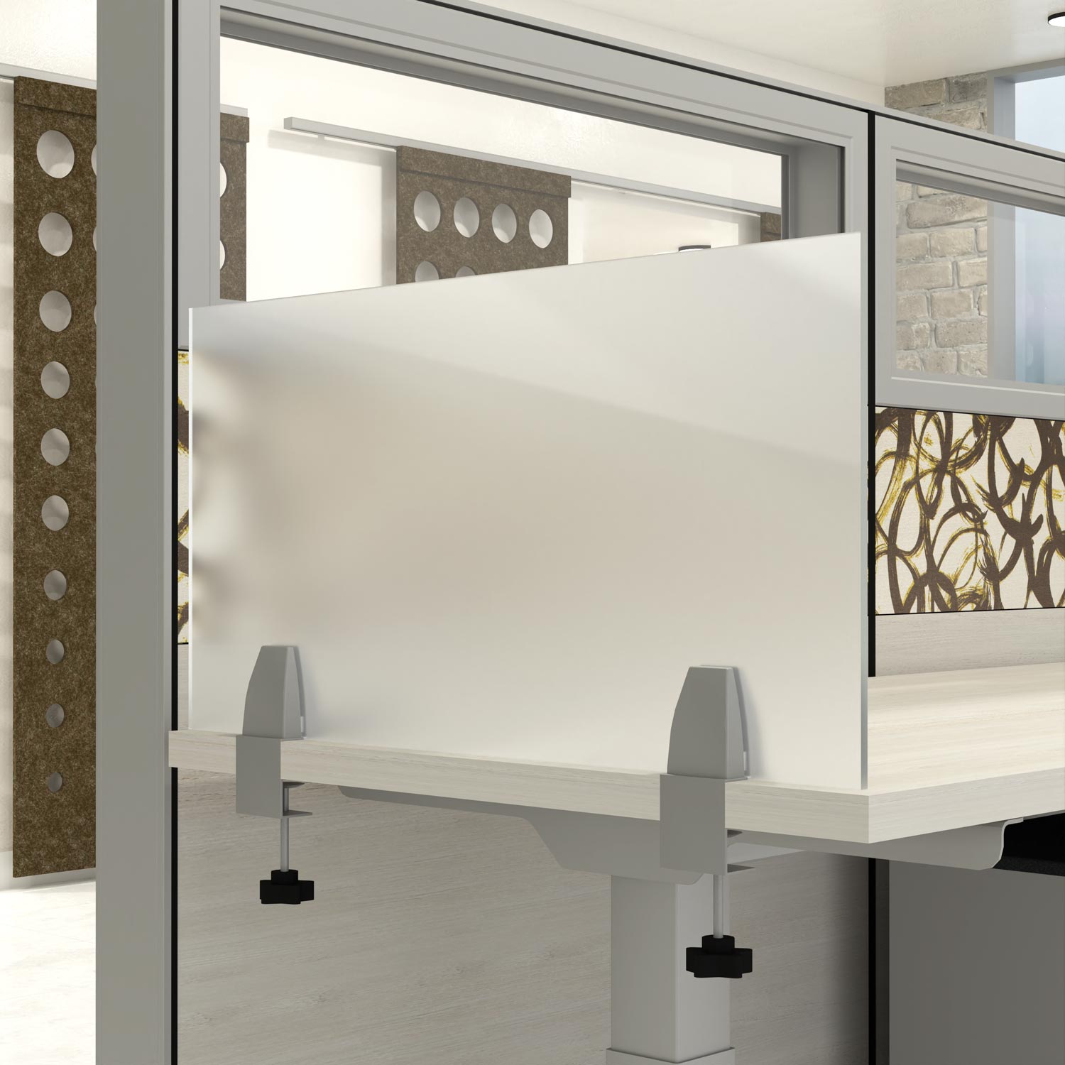 60″W Frosted Acrylic Modesty Panel | Skutchi Designs2-Person Cubicle Workstation | Laminate Gallery Panels | Sol Series | 6x6x52″-39″H