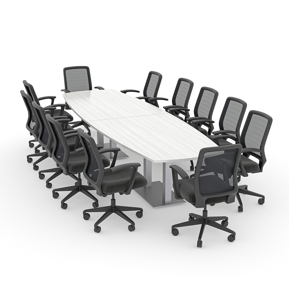 12 Person Conference Room Set | 12′ Arc Boat Shaped Conference Table With Black Mesh Chairs Bundle2-Person Cubicle Workstation | Laminate Gallery Panels | Sol Series | 6x6x52″-39″H