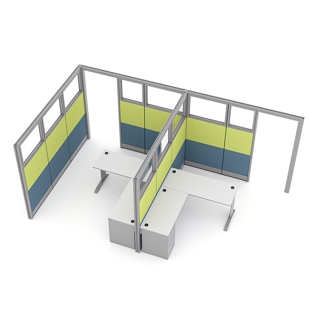 This configuration features Slate and Lime Green fabric topped with glass panels, doorway, White laminate worksurface, and our electrical and networking cord “raceways” hidden along the base to hide messy looking wires and cabling.