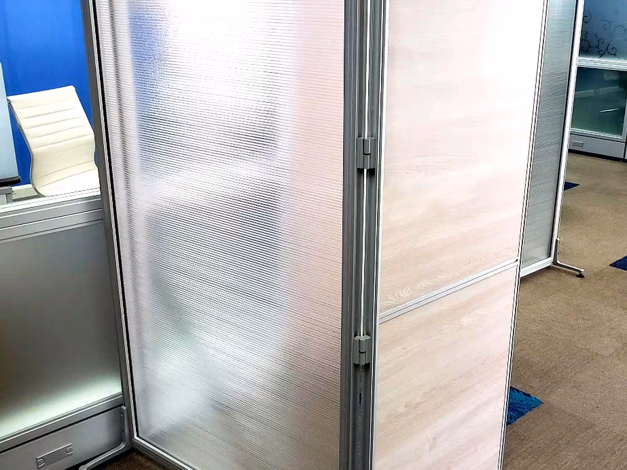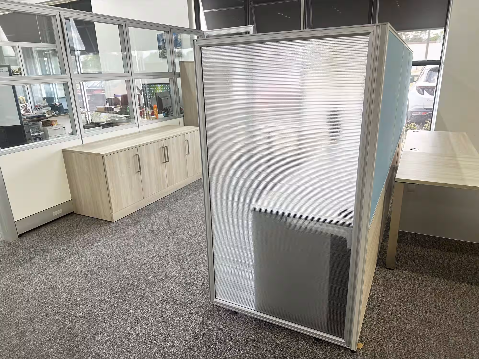 The SAPslim Cubicle System™ features 65” tall panels in corrugated frosted polycarbonate, transparent acrylic, 15 different colored fabrics, or a non-porous laminate surface.