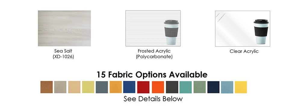 - 15 different fabric colors available in widths: 24″, 36″, 48″, or 60″ (see fabric swatches in available finishes)